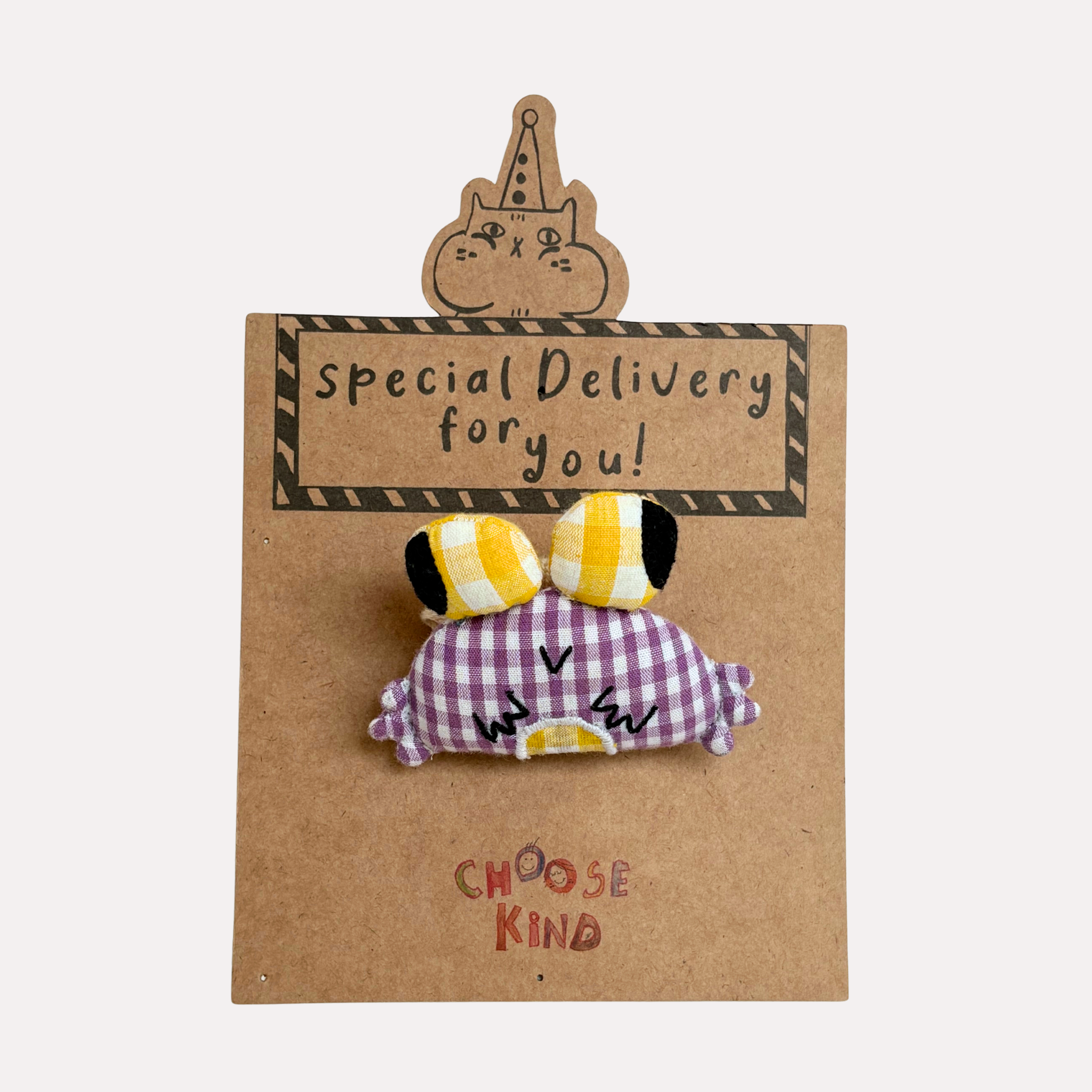 Meet Froodle - kook, a bouncy little frog who hops between giggles and puddles! Made from green and purple upcycled fabric and hand-stitched with love by NGO women, this brooch adds a sprinkle of play to every outfit.