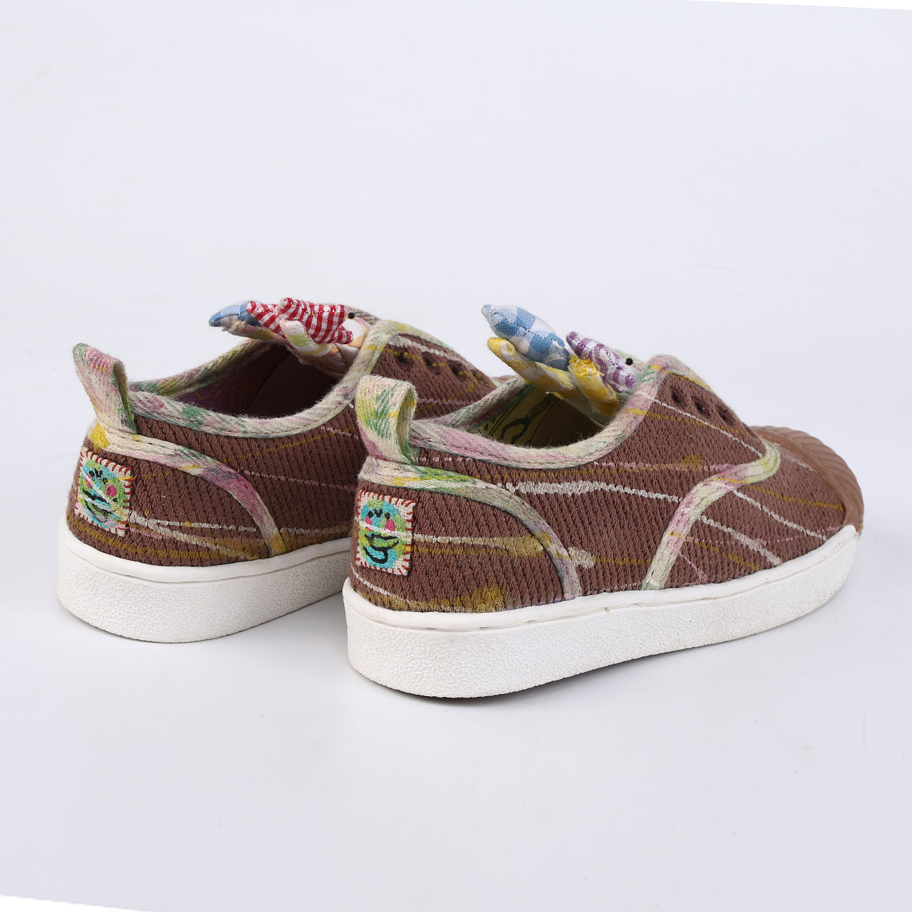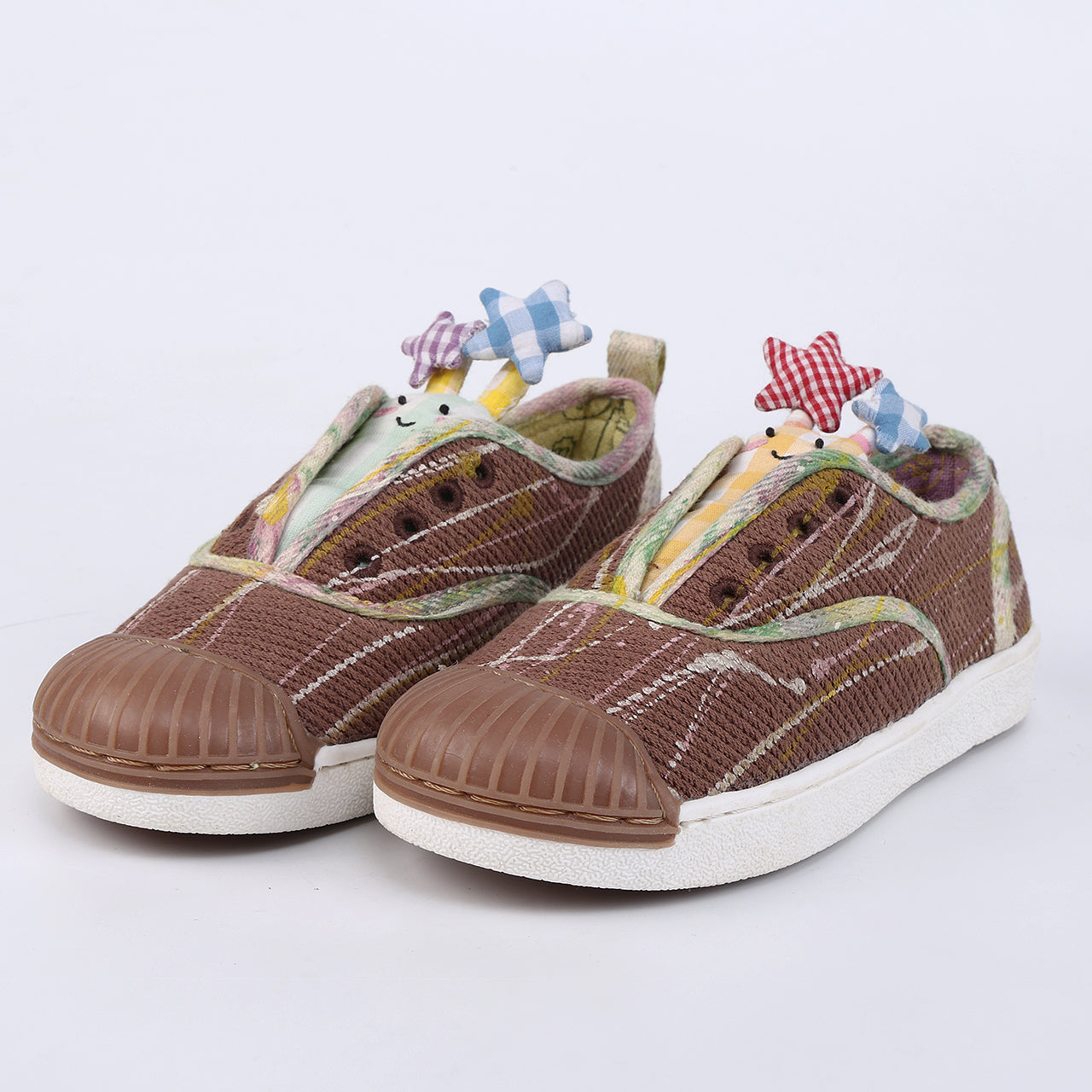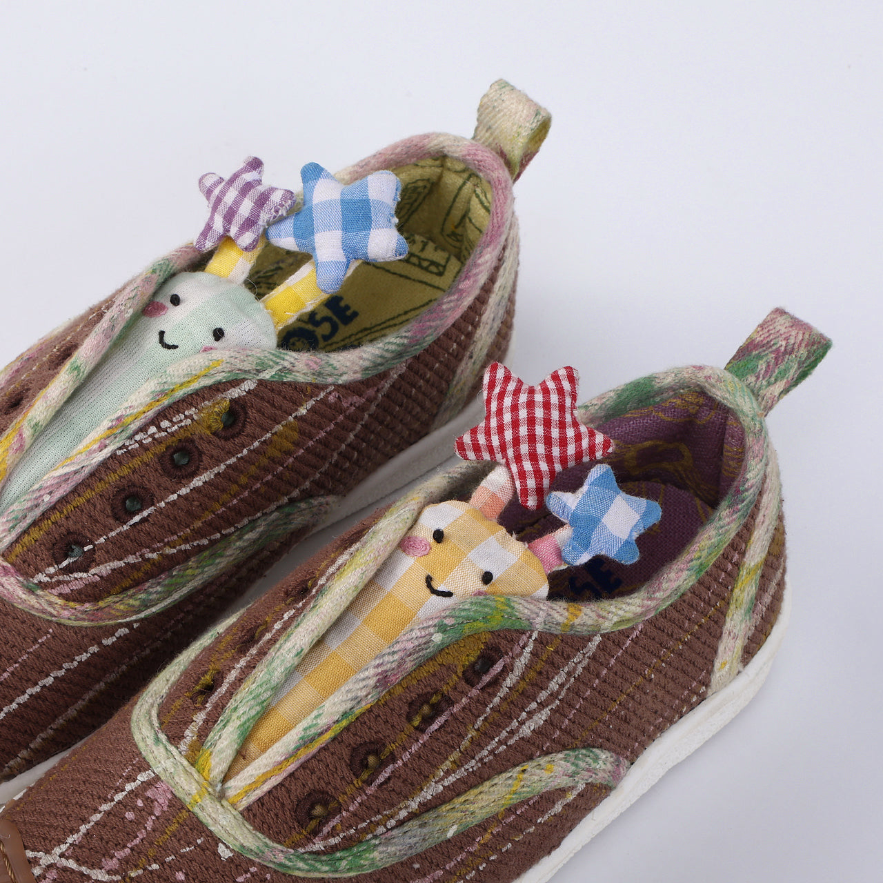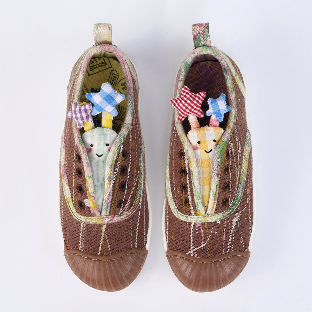 A glowing burst of magic and playful sparkle. DODO–GLOWEE comes in a warm brown base splattered with cheerful pops of colour all over, making every pair feel extra special. Sitting in place of the tongue are two adorable toys in yellow and mint, each topped with starry antennas that add a dreamy glow effect. Fun, artsy, and full of shine, this pair is made to light up little steps with big imagination.