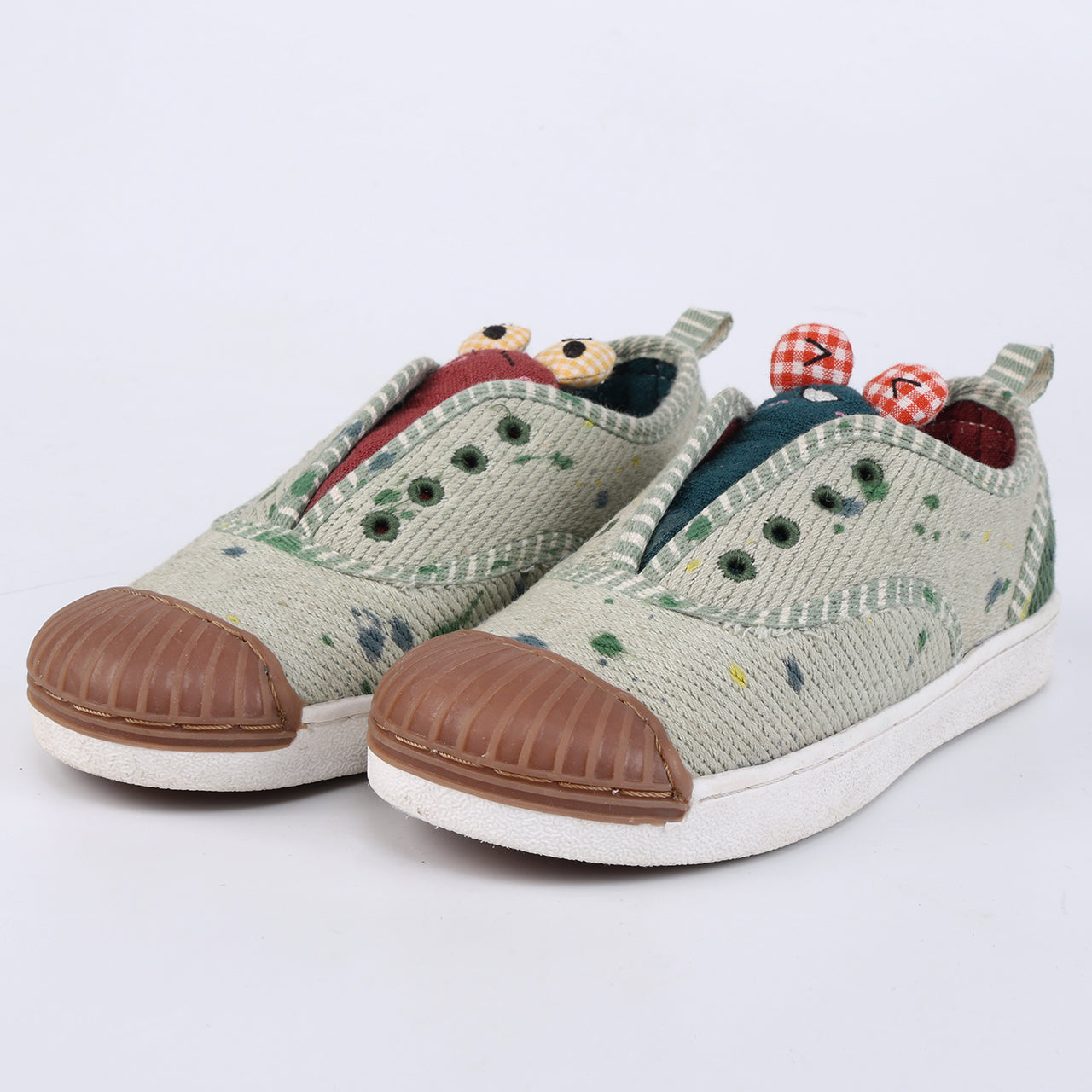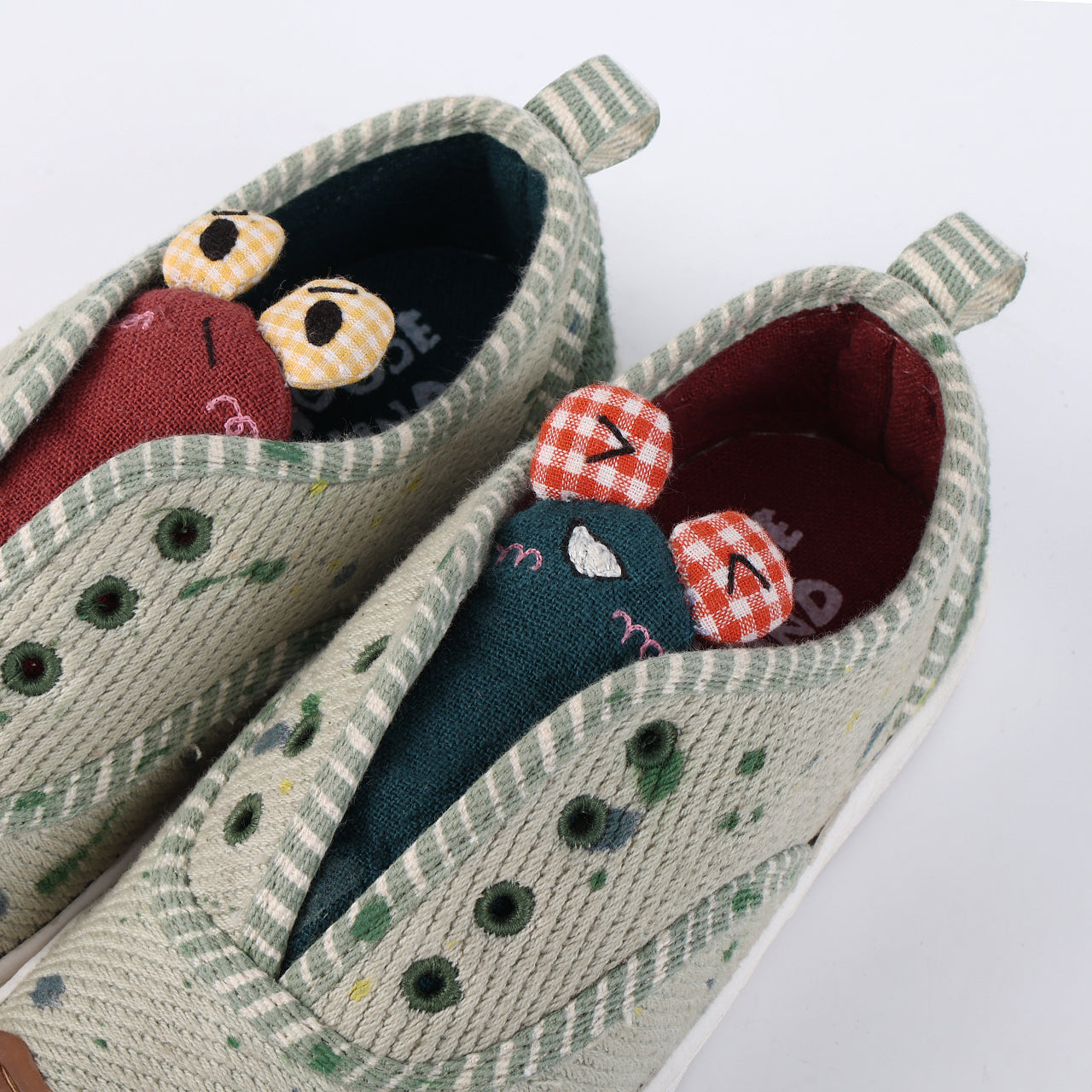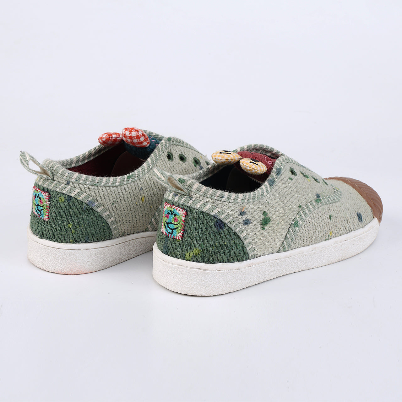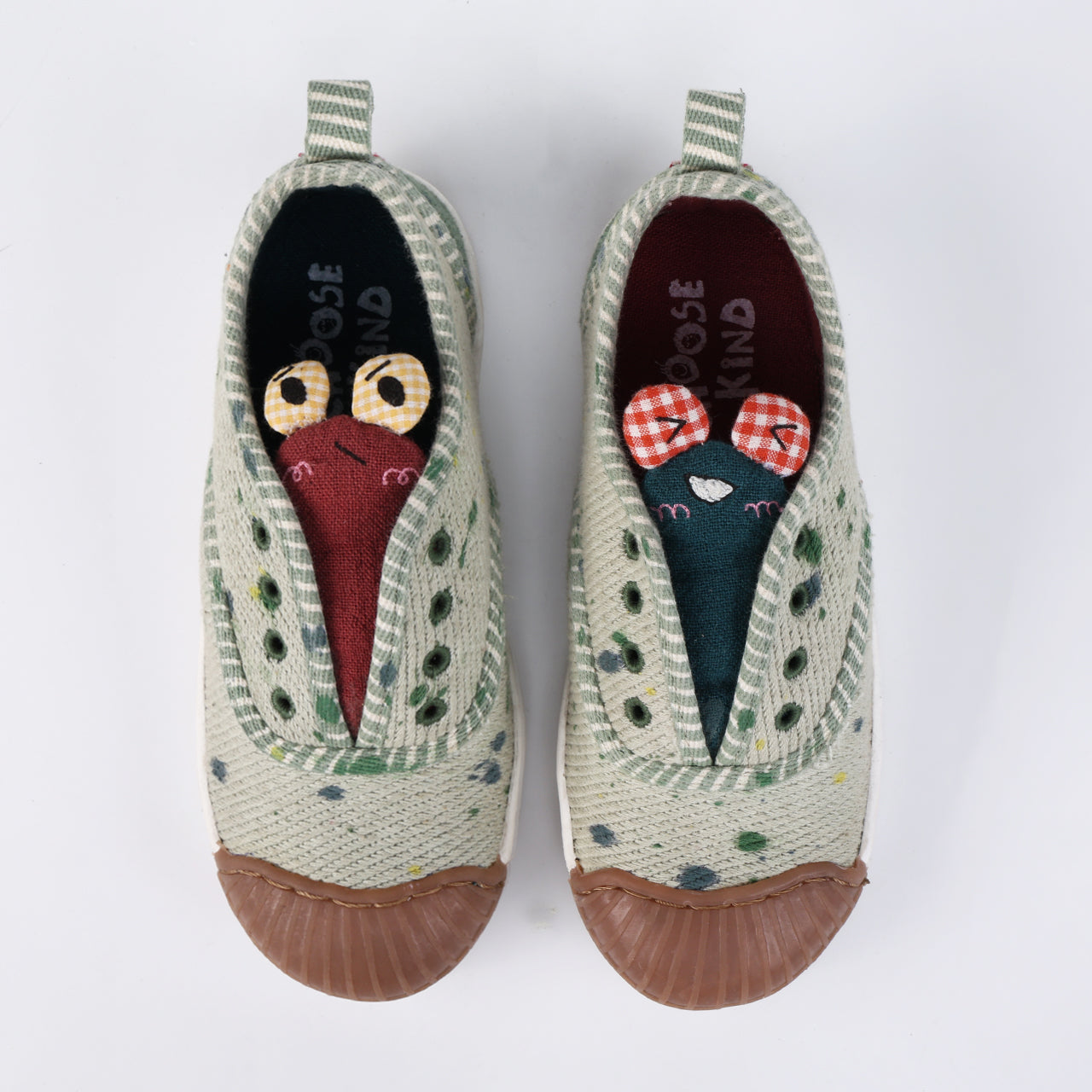 Dodo–Bloop is a splash of playful chaos and froggy attitude. The base comes in a juicy green tone with darker green splattered dots dancing all over, giving it a fun, artsy texture. One shoe features a red frog with an adorably annoyed expression, while the other shows off a teal frog caught mid-laugh.