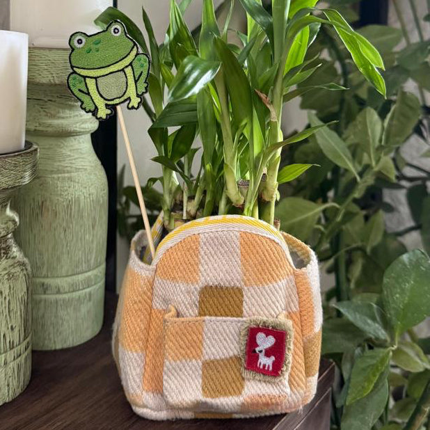 Meet Little Jumper — a cheerful splash of sunshine for your space! This yellow check backpack-shaped Kind Pot comes with a playful frog topper, ready to bring a hop of joy and a sprinkle of nature to your home. Perfect for tiny plants and big smiles.